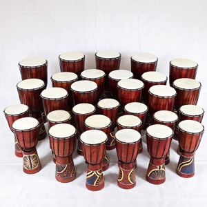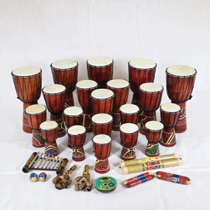 30 player set of three sizes of medium djembe drums and hand percussion.