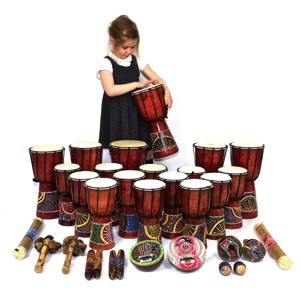 This 30 player class percussion set includes 12 medium sized 30cm djembe and 6 large 40cm djembe.