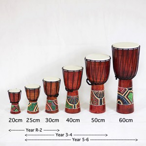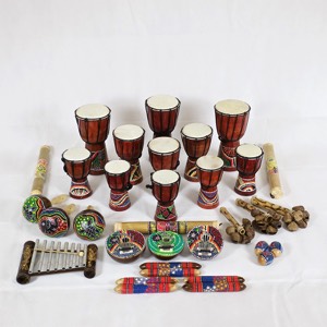 Included are 11 smaller djembe drums of various sizes, 4 different types of shaken instruments, 3 sets of clapslicks, 3 karimba and a rindik. This is designed to give a versatile mix of sounds and playing experiences for small and large groups of children.