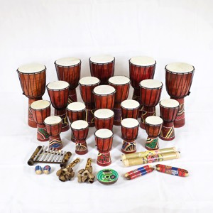 This 30 player class percussion set includes 20 djembe drums of small to large sizes giving a wide tonal range and the versatility of being able to be used with smaller and larger hands.
